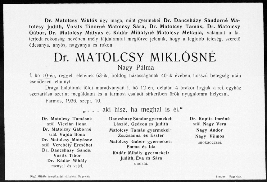 Egy megyebálon ismerkedett meg későbbi férjével, Matolcsy Miklóssal, aki akkor már tanársegéd volt az egyetemen. Mindkét család nagyon ellenezte a tervezett házasságot, de végül 1896. június elsején a Kálvin téri református templomban Szász Károly püspök összeadta a fiatal párt. Az évek során nyolc gyerekük született, akik közül hat élte meg a felnőtt kort. A család kétlaki életet élt, Pesten is volt lakásuk a Boráros tér környékén és Farmoson az úgynevezett Felső-házban. A gyereknevelés, háztartás vezetés mellett az I. világháború utolsó éveiben bekapcsolódott a sebesültek ápolásába és ennek kapcsán ismerkedett meg a vakok helyzetével, problémájával. A testi ápolás mellett lelki vigaszt is nyújtott az ápoltaknak, bibliaórákat, ige-magyarázatokat tartott számukra, bibliát adott a rászorulók kezébe. Ekkor döbbent rá, hogy a vakoknak nincs bibliája.