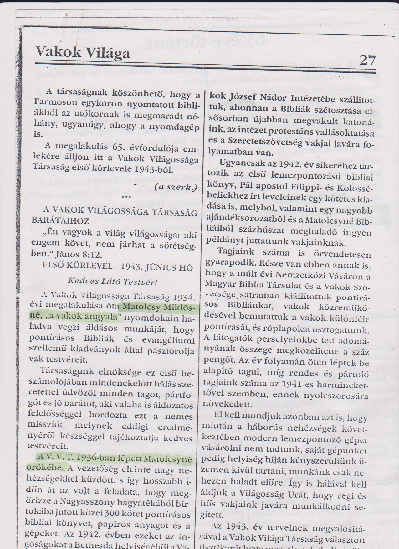 Felvette a kapcsolatot a Vakok Intézetével (itt is szervezett bibliaköröket) majd felkereste Frommer Lajos fegyvergyárost, aki kérésére megszerkesztett – megépített egy Braille írású nyomdagépet, ami a kor technikai színvonalát messze meghaladó szinten, minőségben tudott írásokat, könyveket nyomtatni vakok számára. Hosszú tárgyalások után 40.000 koronáért megvette a gépet. A rengeteg pénzt a református egyház támogatásával hazai és külföldi adományokból, támogatásokból gyűjtötte össze. Farmoson 1925-ben helyezték üzembe a nyomdát a Matolcsy kúria (Felsőház) mellett álló kis Burda házban. A teljes vak Biblia kiadását tervezte, 120 példányban. Néhány kötet híján el is készült a nagy mű. (Egy kötet 25x34 cm-es méretű, 5-6 cm vastag könyv volt; vastag, keményfedelű borítóval). A teljes Biblia 5-6 könyvespolcot töltött meg.